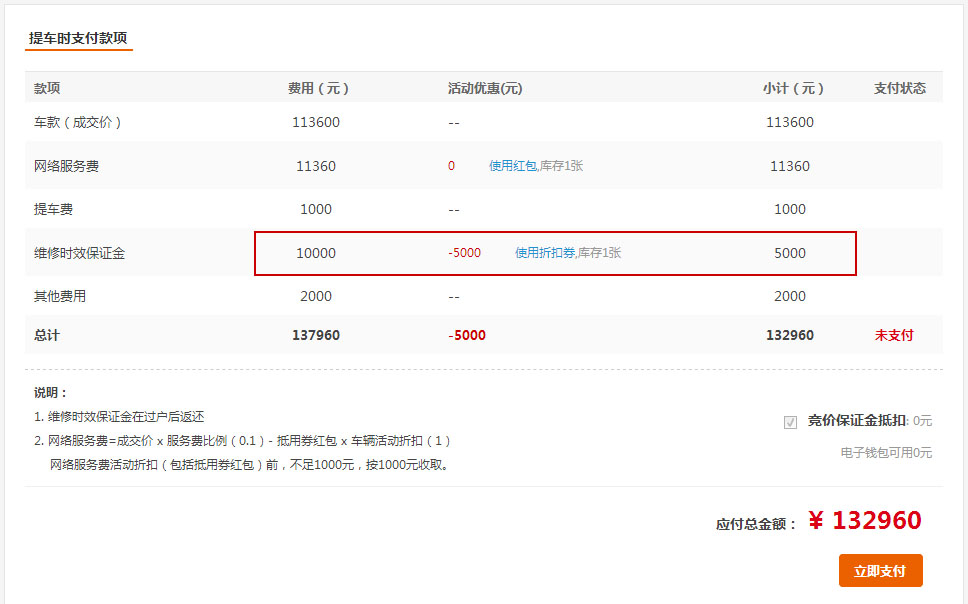 2)右侧提车时支付款项-活动优惠,点击蓝色字“使用红包”和“使用折扣券”操作使用。